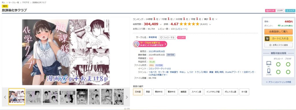「放課後化学クラブ」はDLサイトのみで配信中、初回登録クーポンを利用すると140円で全ページ読むことができます!